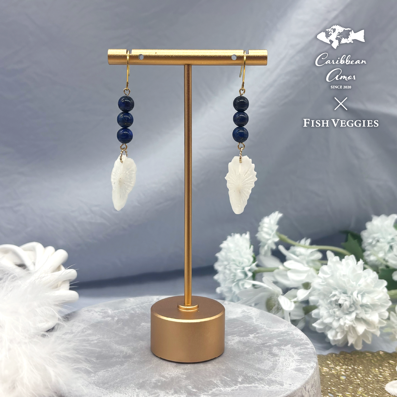 チョウザメの鱗に天然石をあしらい、それぞれの石ごとにお守りや願いが込められたデザインの耳飾り。
